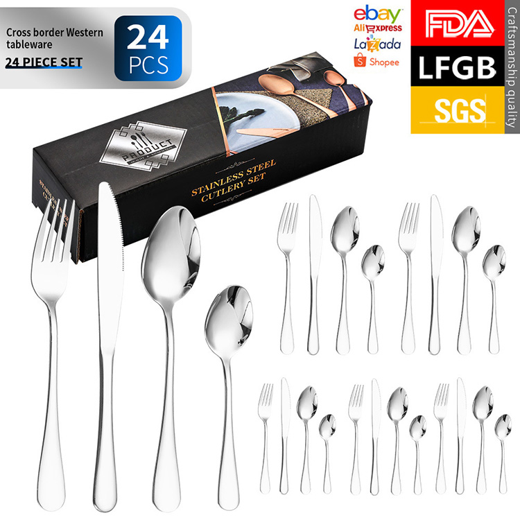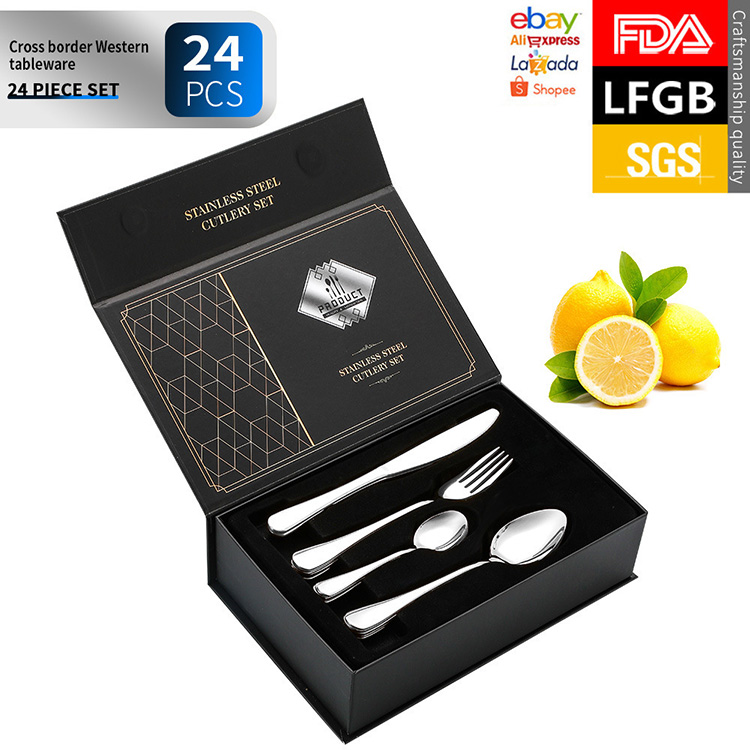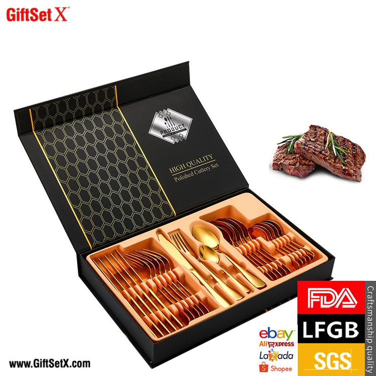 Set hadiah Pisau Pisau Keluli Tahan Karat berkualiti tinggi GiftSetX termasuk 24 item, Sudu Garpu Pisau dan Penyepit, yang boleh anda suaikan logo produk anda, reka bentuk kotak pembungkusan dan warna berwarna-warni pilihan. Dibuat dengan keluli tahan karat 304 dan 18/10 berkualiti tinggi, ia Kukuh dan Tahan Lama, Tidak Perlu Digilap. Kami mempunyai stok di gudang, yang membolehkan tindakan pantas, menyokong perniagaan penghantaran drop anda dengan lancar. Hubungi kami untuk membincangkan pilihan penyesuaian dan banyak lagi, GiftSetX akan menjadikan idea perniagaan anda menjadi nyata dan pantas dengan usaha yang paling rendah.